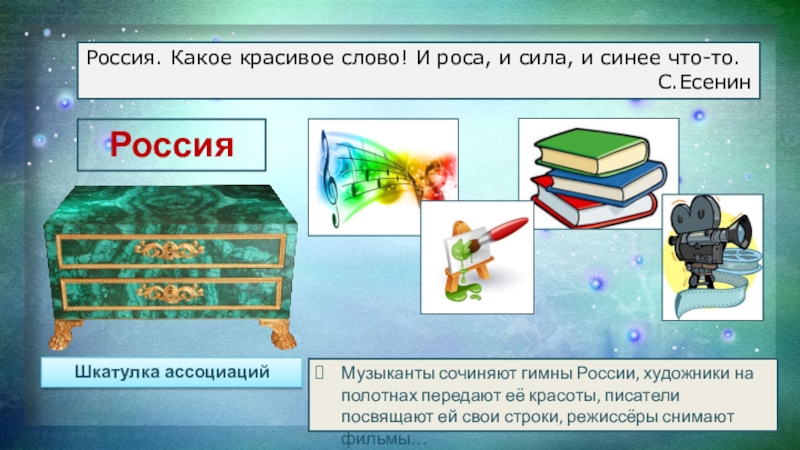 Музыканты сочиняют гимны России, художники на полотнах передают её красоты, писатели посвящают ей свои строки, режиссёры снимают фильмы…