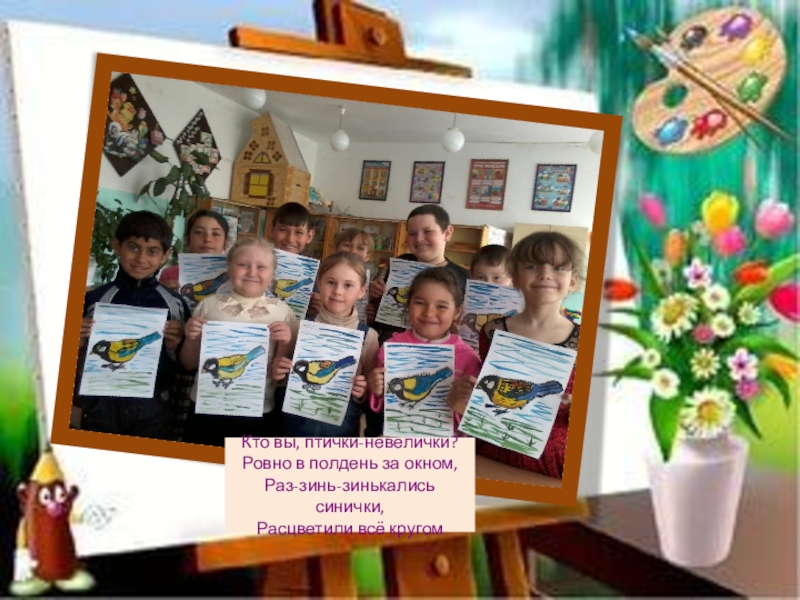 Кто вы, птички-невелички?Ровно в полдень за окном,Раз-зинь-зинькались синички,Расцветили всё кругом