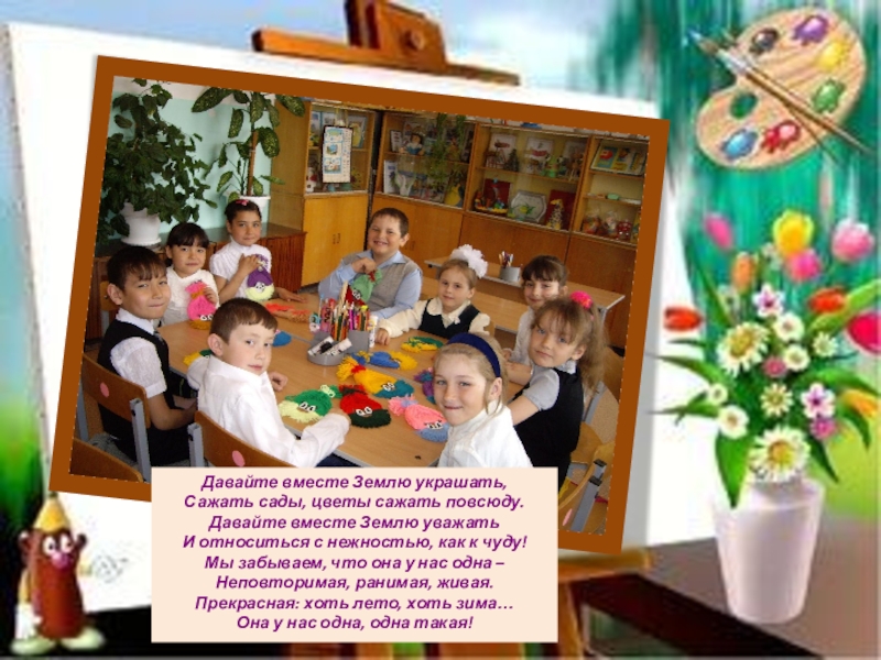 Слайд 2Давайте вместе Землю украшать, Сажать сады, цветы сажать повсюду. Давайте вместе Землю уважать И