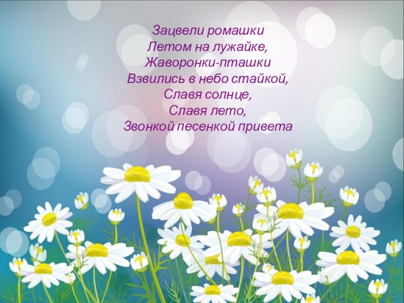 Зацвели ромашкиЛетом на лужайке,Жаворонки-пташкиВзвились в небо стайкой,Славя солнце,Славя лето,Звонкой песенкой привета