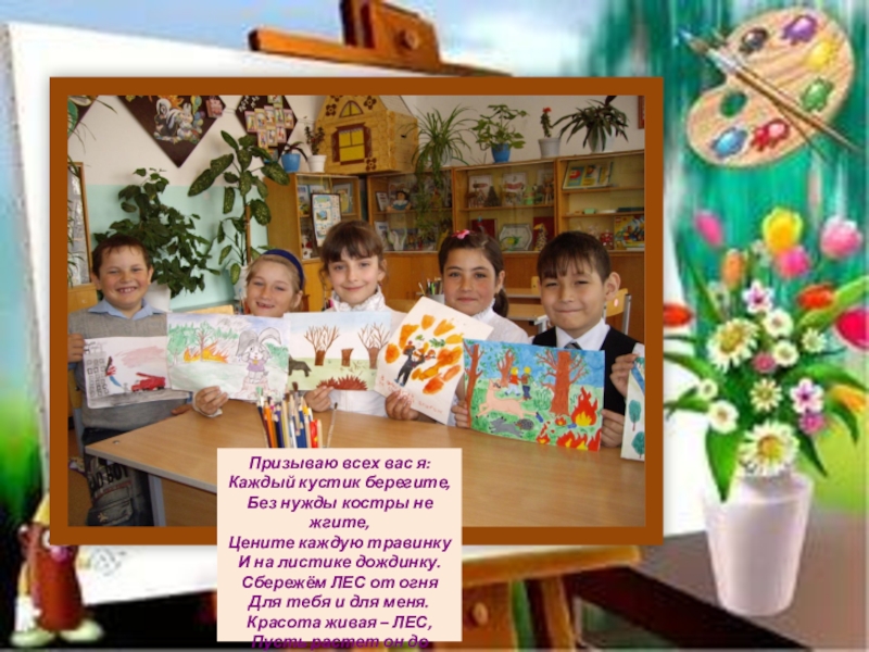 Призываю всех вас я: Каждый кустик берегите, Без нужды костры не жгите, Цените каждую травинку И на