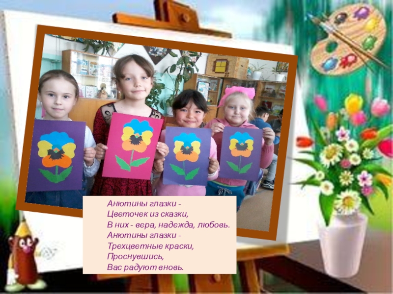 Анютины глазки -Цветочек из сказки,В них - вера, надежда, любовь.Анютины глазки -Трехцветные краски,Проснувшись,Вас радуют вновь.