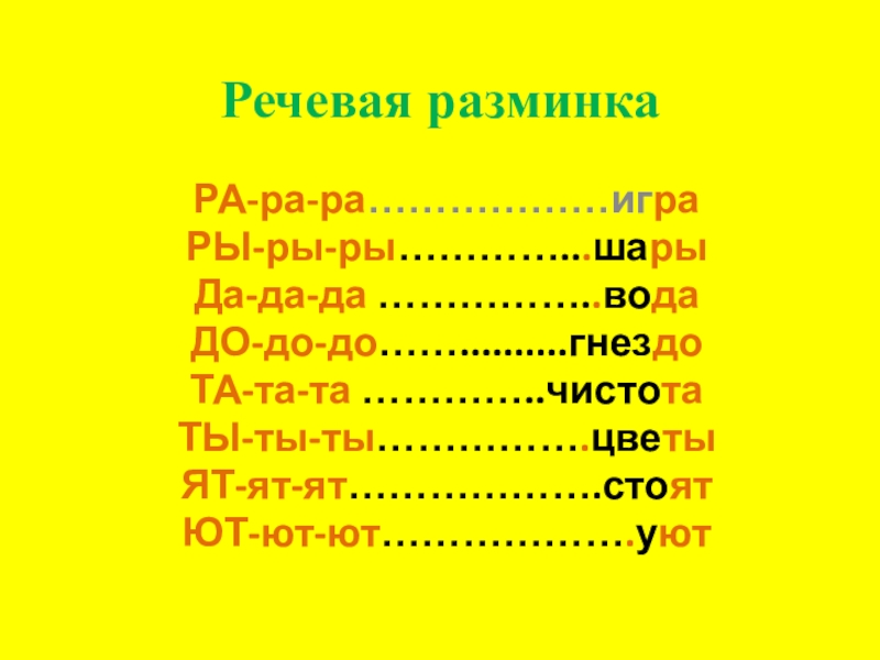 Речевая разминкаРА-ра-ра………………играРЫ-ры-ры…………...шарыДа-да-да ……………..водаДО-до-до……..........гнездоТА-та-та …………..чистотаТЫ-ты-ты…………….цветыЯТ-ят-ят……………….стоятЮТ-ют-ют……………….уют