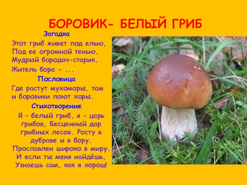 Я – белый гриб, я – царь грибов, Бесценный дар грибных лесов. Росту в дубраве и в бору. Прославлен широко в миру. И если ты меня найдёшь, Узнаешь сам, как я хорош!