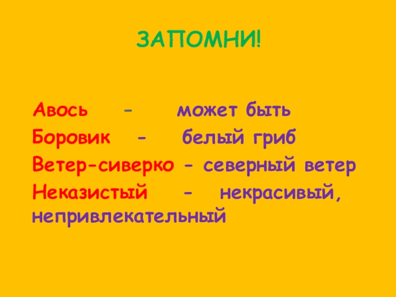 ЗАПОМНИ!Авось  -   может бытьБоровик  -  белый грибВетер-сиверко - северный ветерНеказистый  -