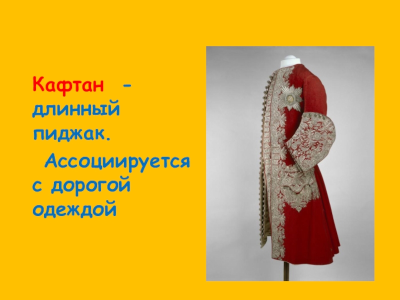 Кафтан - длинный пиджак.  Ассоциируется с дорогой одеждой