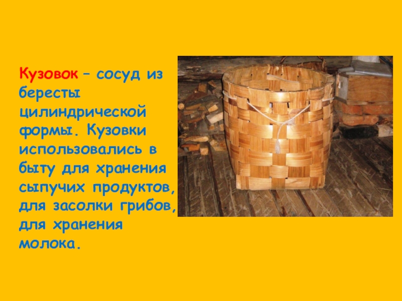 Кузовок – сосуд из бересты цилиндрической формы. Кузовки использовались в быту для хранения сыпучих продуктов, для засолки