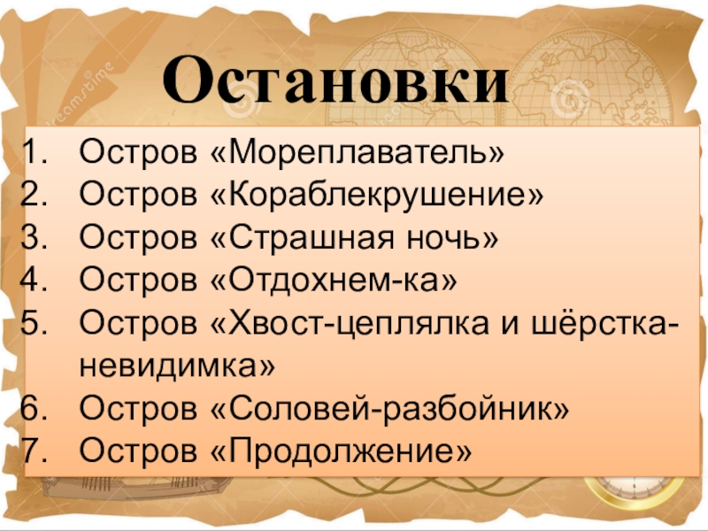 Остров «Мореплаватель»Остров «Кораблекрушение»Остров «Страшная ночь»Остров «Отдохнем-ка»Остров «Хвост-цеплялка и шёрстка-невидимка»Остров «Соловей-разбойник»Остров «Продолжение»Остановки