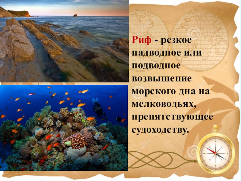 Риф - резкое надводное или подводное возвышение морского дна на мелководьях, препятствующее судоходству.