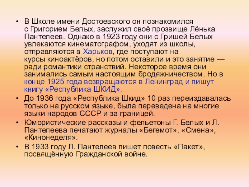 Лёнька Пантелеев. Однако в 1923 году они с Гришей Белых увлекаются кинематографом, уходят из школы, отправляются в Харьков, где поступают на курсы киноактёров, но потом оставили и это занятие — ради романтики странствий. Некоторое время они занимались самым настоящим бродяжничеством. Но в конце 1925 года возвращаются в Ленинград и пишут книгу «Республика ШКИД».