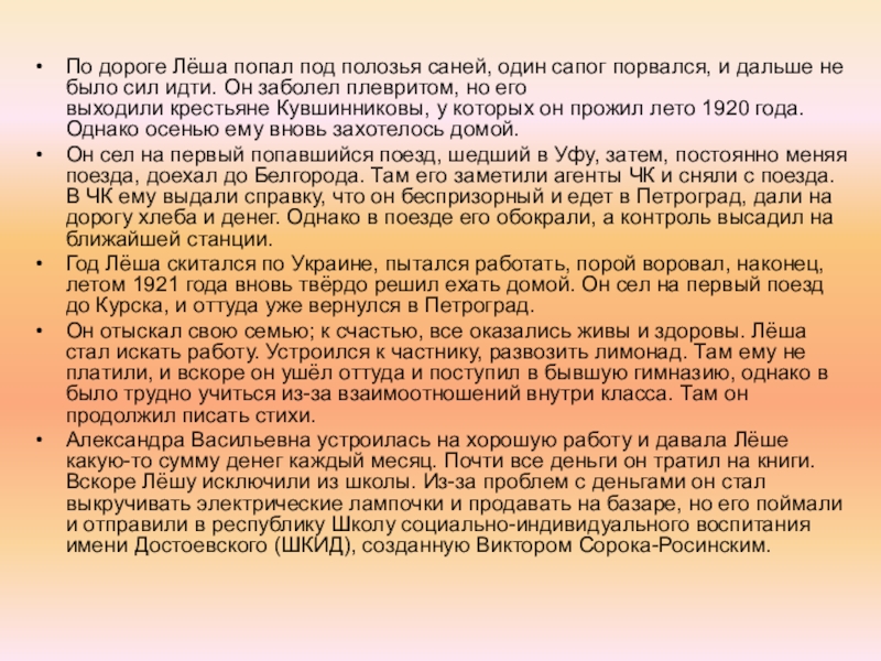 Александра Васильевна устроилась на хорошую работу и давала Лёше какую-то сумму денег каждый месяц. Почти все деньги он тратил на книги. Вскоре Лёшу исключили из школы. Из-за проблем с деньгами он стал выкручивать электрические лампочки и продавать на базаре, но его поймали и отправили в республику Школу социально-индивидуального воспитания имени Достоевского (ШКИД), созданную Виктором Сорока-Росинским.