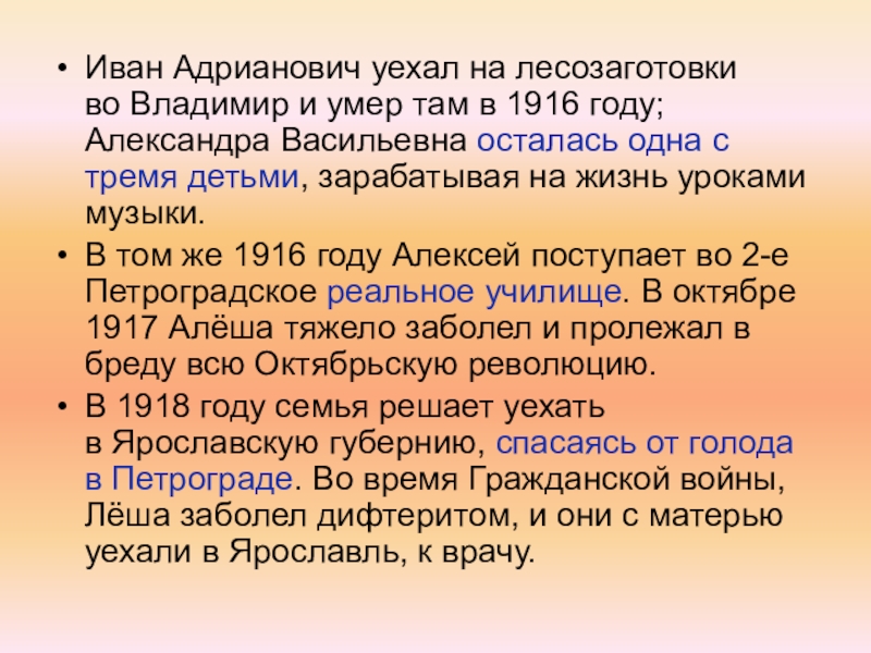 Слайд 3Иван Адрианович уехал на лесозаготовки во Владимир и умер там в 1916 году;