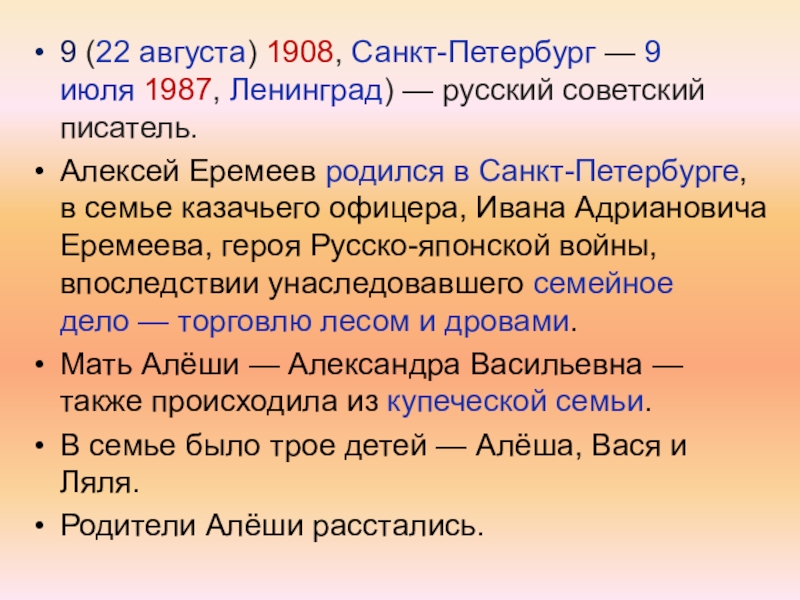 Слайд 29 (22 августа) 1908, Санкт-Петербург — 9 июля 1987, Ленинград) — русский советский писатель.