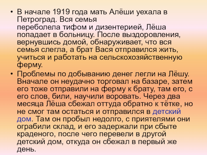 Слайд 6В начале 1919 года мать Алёши уехала в Петроград. Вся семья переболела тифом и дизентерией, Лёша
