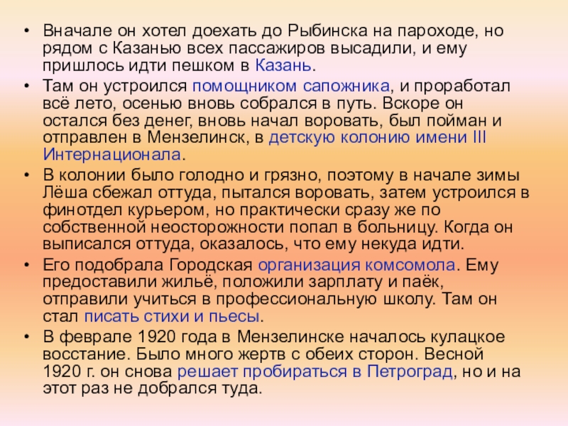 Там он устроился помощником сапожника, и проработал всё лето, осенью вновь собрался в путь. Вскоре он остался без денег, вновь начал воровать, был пойман и отправлен в Мензелинск, в детскую колонию имени III Интернационала.