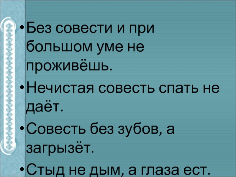 Без совести и при большом уме не проживёшь.Нечистая совесть спать не даёт.Совесть без зубов, а загрызёт.Стыд не