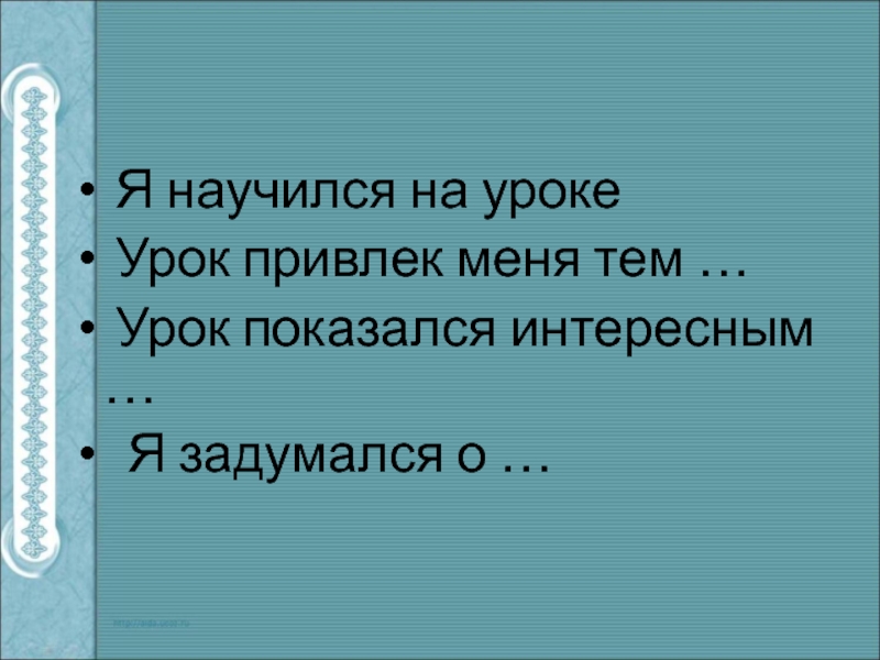 Я научился на уроке Урок привлек меня тем … Урок показался интересным … Я задумался о