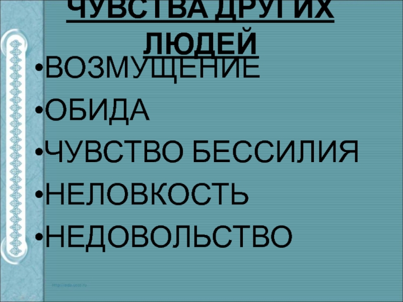 ЧУВСТВА ДРУГИХ ЛЮДЕЙВОЗМУЩЕНИЕОБИДАЧУВСТВО БЕССИЛИЯНЕЛОВКОСТЬНЕДОВОЛЬСТВО