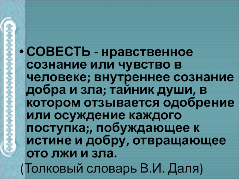 СОВЕСТЬ - нравственное сознание или чувство в человеке; внутреннее сознание добра