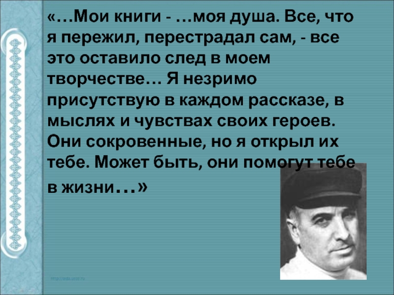 «…Мои книги - …моя душа. Все, что я пережил, перестрадал сам, - все это оставило след в моем творчестве… Я незримо присутствую в каждом рассказе, в мыслях и чувствах своих героев. Они сокровенные, но я открыл