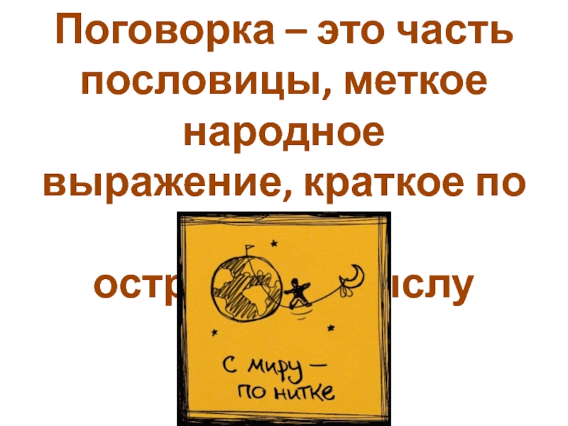 Поговорка – это часть пословицы, меткое народноевыражение, краткое по формеострое по смыслу