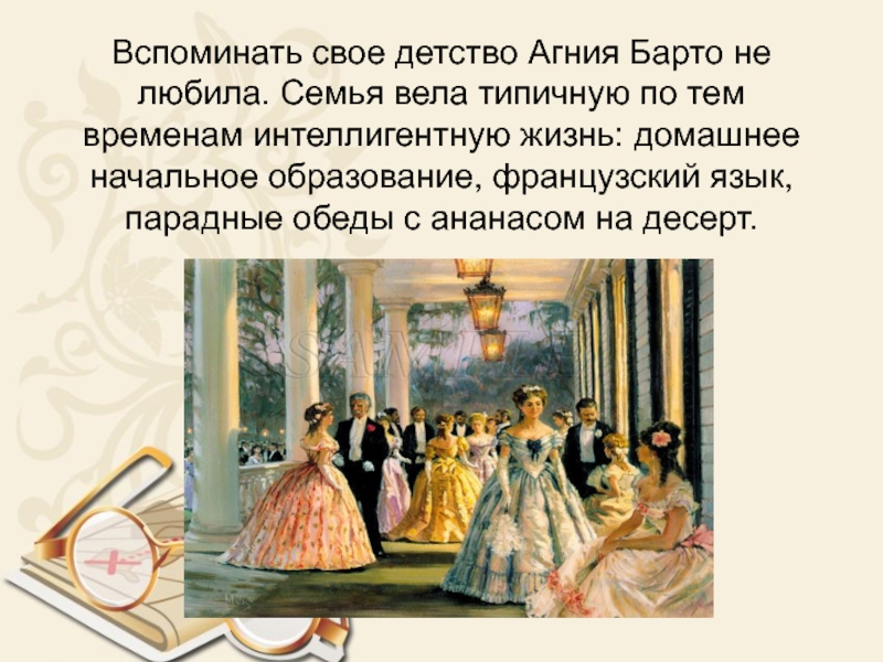 тем временам интеллигентную жизнь: домашнее начальное образование, французский язык, парадные обеды с ананасом на десерт.