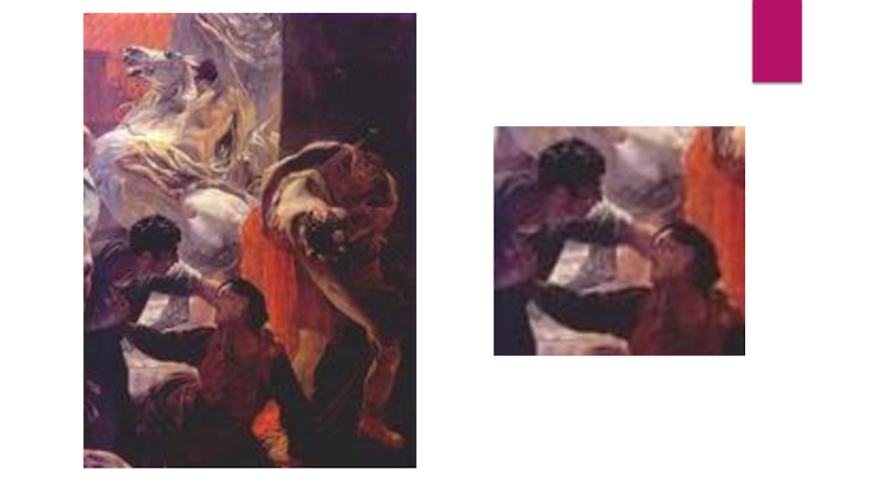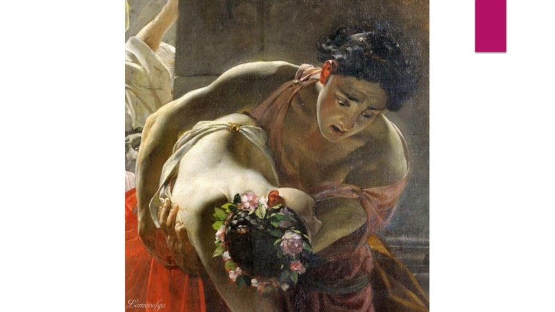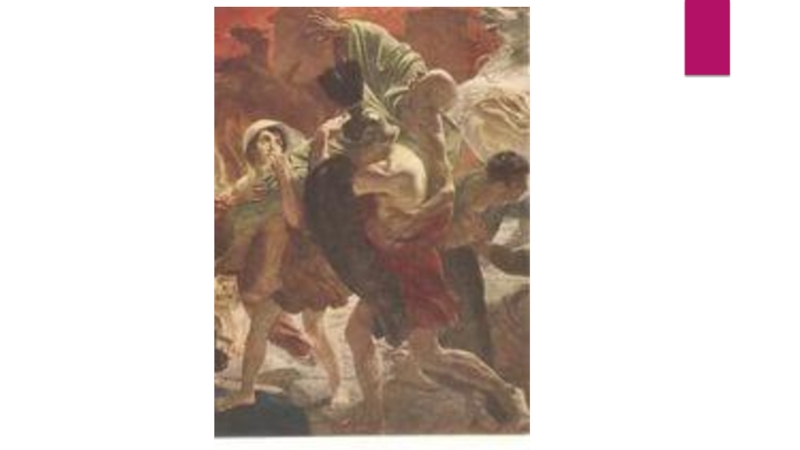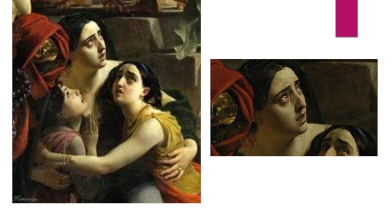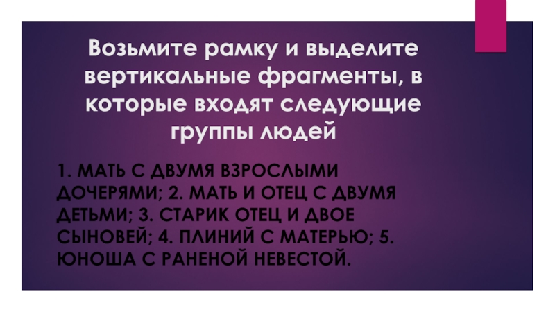 1. Мать с двумя взрослыми дочерями; 2. мать и отец с двумя детьми; 3. старик отец и двое сыновей; 4. Плиний с матерью; 5. юноша с раненой невестой.