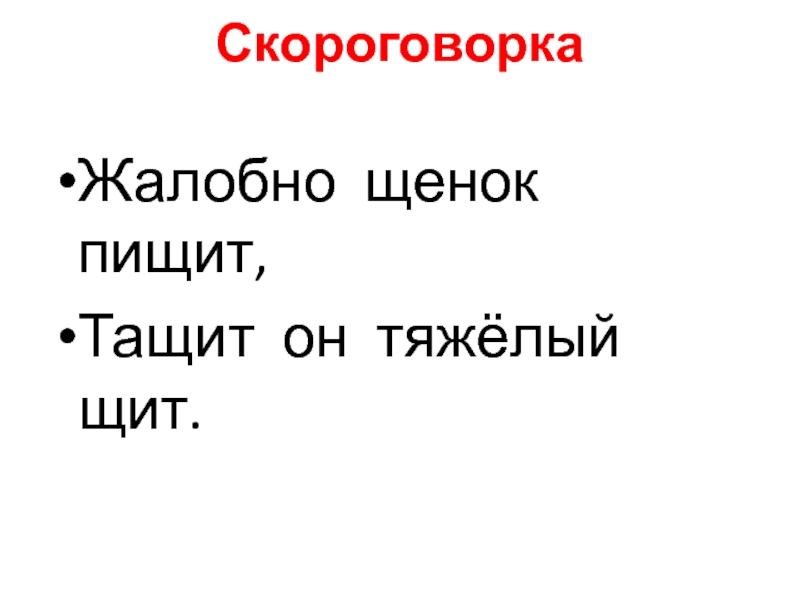 Скороговорка Жалобно щенок пищит,Тащит он тяжёлый щит.