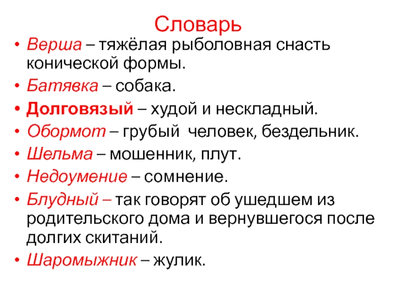 Словарь Верша – тяжёлая рыболовная снасть конической формы.Батявка – собака.Долговязый – худой и нескладный.Обормот – грубый человек,