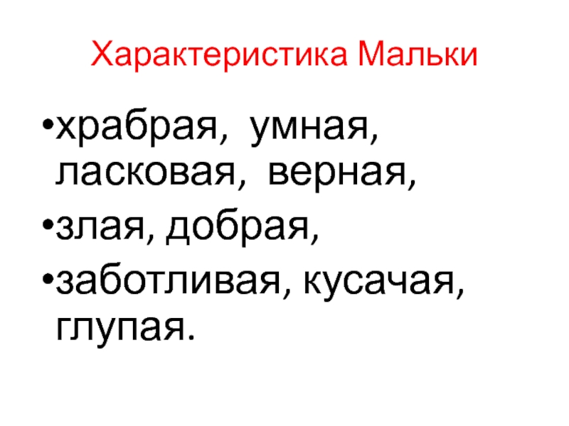 Характеристика Малькихрабрая, умная, ласковая, верная,злая, добрая, заботливая, кусачая, глупая.