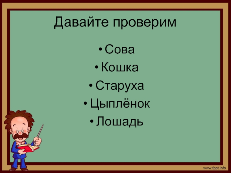 Давайте проверимСоваКошкаСтарухаЦыплёнокЛошадь