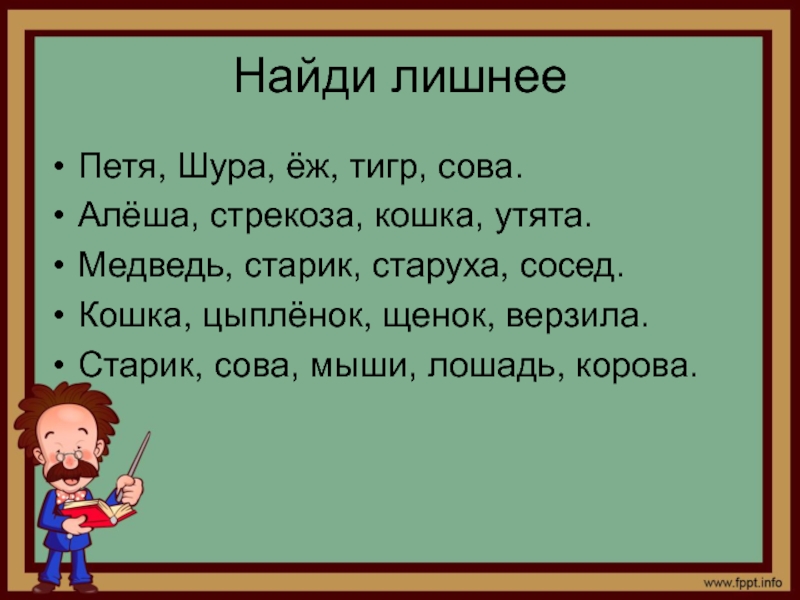 Найди лишнееПетя, Шура, ёж, тигр, сова.Алёша, стрекоза, кошка, утята.Медведь, старик, старуха, сосед.Кошка, цыплёнок, щенок, верзила.Старик, сова, мыши,