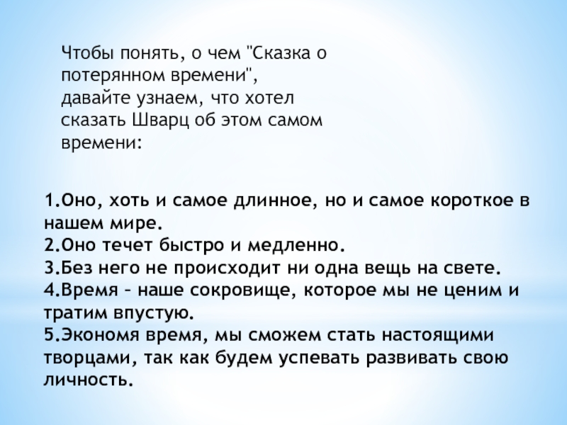 Чтобы понять, о чем "Сказка о потерянном времени", давайте узнаем, что хотел сказать Шварц об этом самом времени: