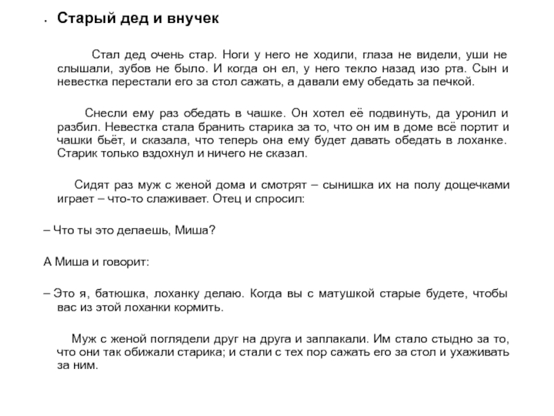 Ноги у него не ходили, глаза не видели, уши не слышали, зубов не было. И когда он ел, у него текло назад изо рта. Сын и невестка перестали его за стол сажать, а давали ему обедать за печкой.