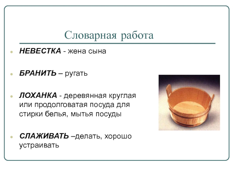 Снесли ему раз обедать в чашке. Он хотел её подвинуть, да уронил и разбил. Невестка стала бранить старика за то, что он им в доме всё портит и чашки бьёт, и сказала, что теперь она ему будет давать обедать в лоханке. Старик только вздохнул и ничего не сказал.