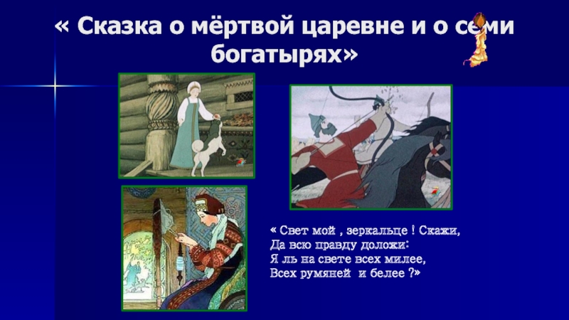 « Сказка о мёртвой царевне и о семи богатырях»« Свет мой, зеркальце ! Скажи,Да всю правду доложи:Я