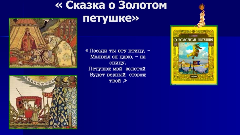 « Сказка о Золотом петушке»« Посади ты эту птицу, -Молвил он царю, - на спицу.Петушок мой золотойБудет