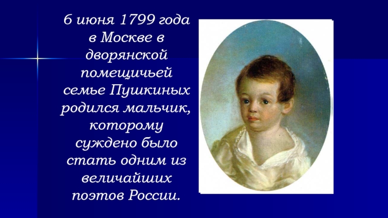 6 июня 1799 года в Москве в дворянской помещичьей семье Пушкиных родился мальчик, которому суждено было стать