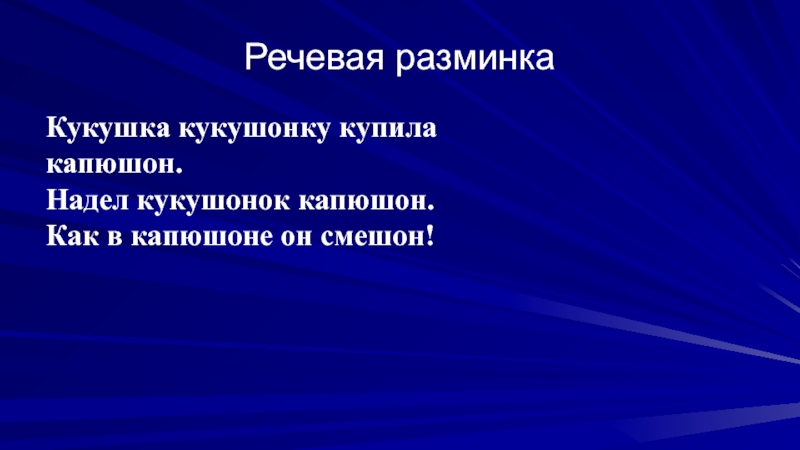 Речевая разминкаКукушка кукушонку купила капюшон. Надел кукушонок капюшон. Как в капюшоне он смешон!