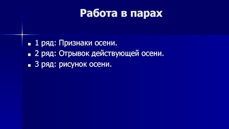 Работа в парах 1 ряд: Признаки осени.2 ряд: Отрывок действующей осени.3 ряд: рисунок осени.
