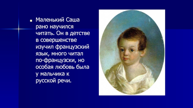 Маленький Саша рано научился читать. Он в детстве в совершенстве изучил французский язык, много читал по-французски, но