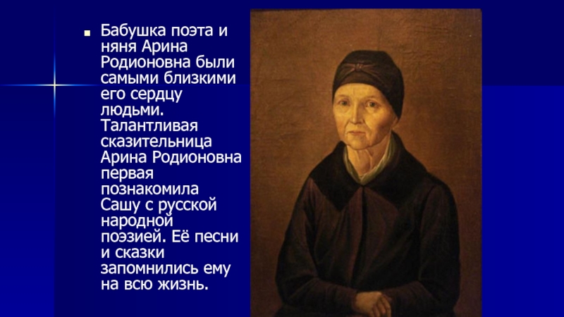 Слайд 5Бабушка поэта и няня Арина Родионовна были самыми близкими его сердцу