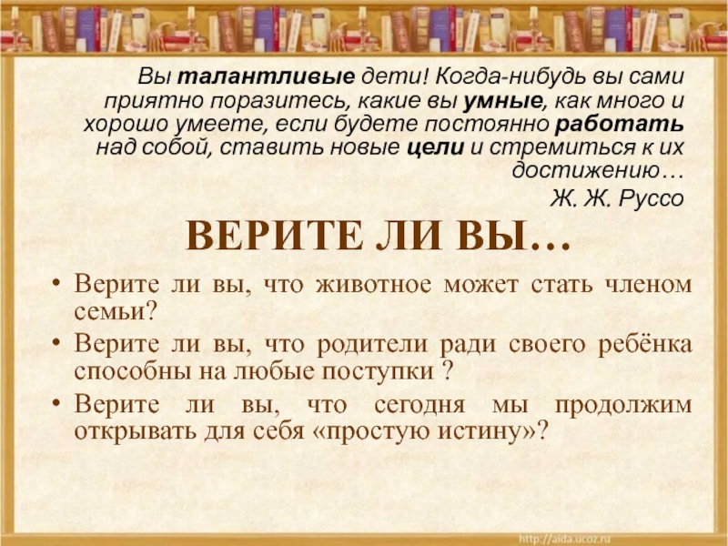 Это сайт презентаций, где можно хранить и обмениваться своими презентациями, докладами, проектами, шаблонами в формате PowerPoint с другими пользователями. Мы помогаем школьникам, студентам, учителям, преподавателям хранить и обмениваться учебными материалами.
