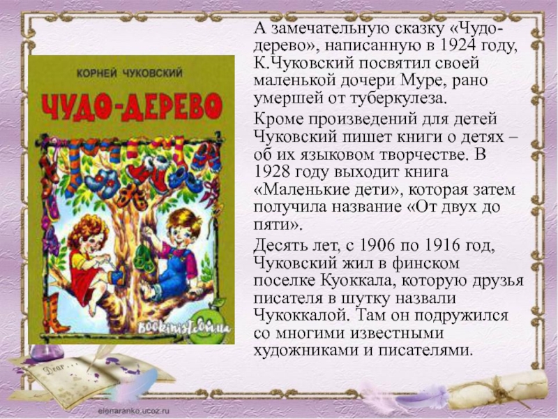 Слайд 7А замечательную сказку «Чудо-дерево», написанную в 1924 году, К.Чуковский посвятил своей