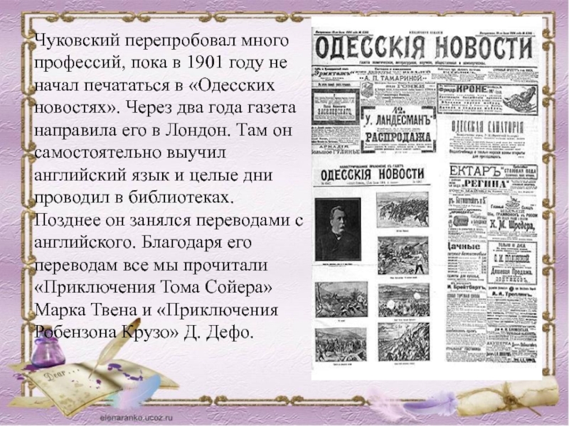 в «Одесских новостях». Через два года газета направила его в Лондон. Там он самостоятельно выучил английский язык и целые дни проводил в библиотеках. Позднее он занялся переводами с английского. Благодаря его переводам все мы прочитали «Приключения Тома Сойера» Марка Твена и «Приключения Робензона Крузо» Д. Дефо.