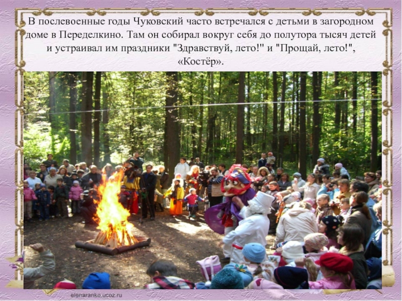в Переделкино. Там он собирал вокруг себя до полутора тысяч детей и устраивал им праздники "Здравствуй, лето!" и "Прощай, лето!", «Костёр».