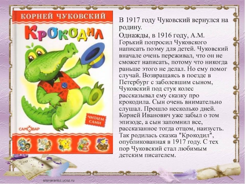 Горький попросил Чуковского написать поэму для детей. Чуковский вначале очень переживал, что он не сможет написать, потому что никогда раньше этого не делал. Но ему помог случай. Возвращаясь в поезде в Петербург с заболевшим сыном, Чуковский под стук колес рассказывал ему сказку про крокодила. Сын очень внимательно слушал. Прошло несколько дней. Корней Иванович уже забыл о том эпизоде, а сын запомнил все, рассказанное тогда отцом, наизусть. Так родилась сказка "Крокодил", опубликованная в 1917 году. С тех пор Чуковский стал любимым детским писателем.
