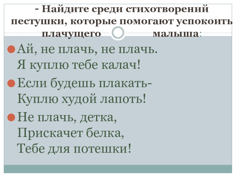 Слайд 4- Найдите среди стихотворений пестушки, которые помогают успокоить плачущего