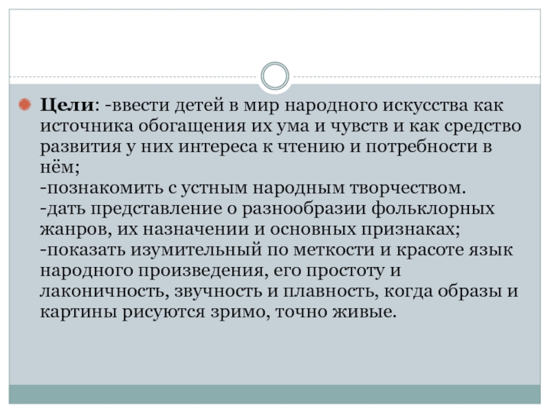 Цели: -ввести детей в мир народного искусства как источника обогащения их