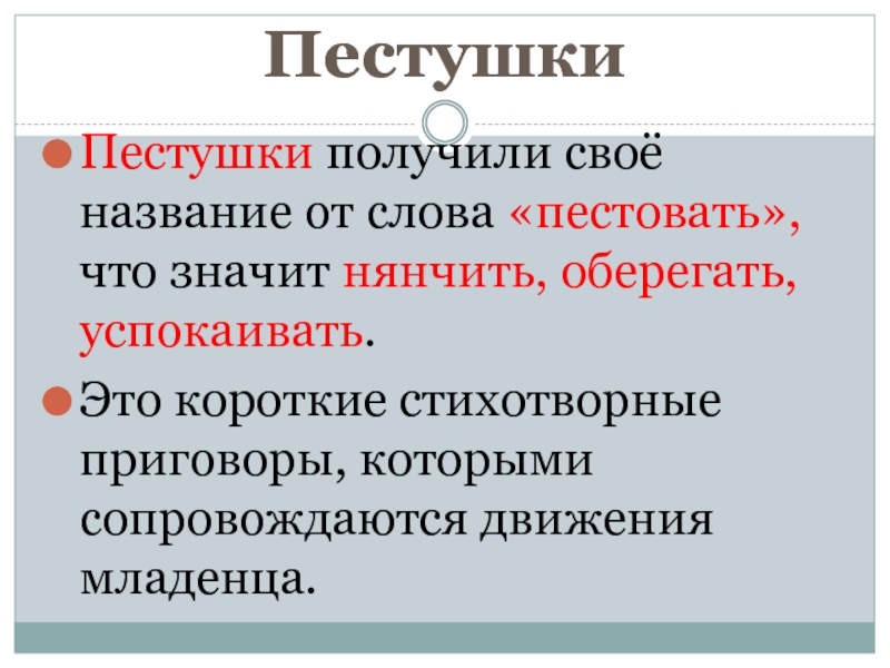 Пестушки получили своё название от слова «пестовать», что значит нянчить, оберегать,
